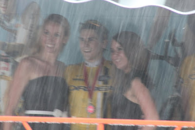 June 13th - Sunday’s weather was a little more intense. Now racing a 3mile circuit for a total of 80miles in 91’F, with full squads of both Jelly Belly and Kelly Benefit Strategies, the heat was one. We were very active at the beginning of the race but as the heat sapped our energy, Mike was the only one of us who made the race deciding split. With 6 laps to go, thunder and lightning showed up with a healthy dose of agua to quench everyone’s thirst, which was extreme as many riders fed every lap! In the finale, with the wind hollowing and only a few spectators left, the sky just pouring buckets, Mike brought home a 7th place finish (fifth in the bunch after two Kelly Benefit riders rode away) despite brake problems which compensated his position into the final, double apex 180’ corner. A very impressive ride! Mike’s Garmin computer said the average temperature over the 2 hour 15 minute race was 35 degrees Celsius with a maximum temperature of 39. Needless to say after three of us dropped, we are hopeful that Nature Valley and Superweek will be cooler as we are definitely not acclimatized to racing in such conditions.